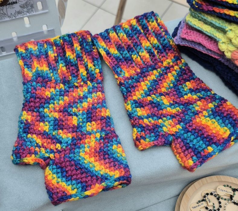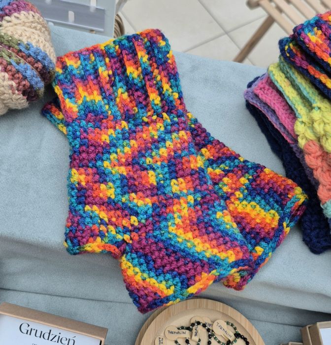 Mitenki wykonane są na szydełku. Są różnokolorowe. Mają rozmiar uniwersalny.