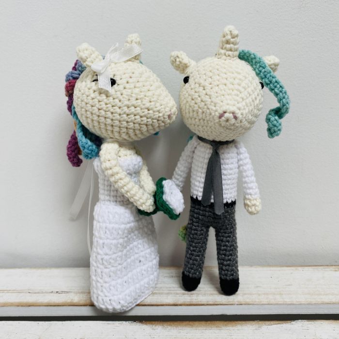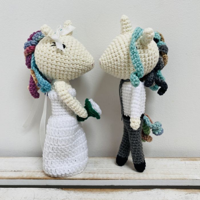 Młoda Para – ślubne jednorożce maskotki, wykonane ręcznie na szydełku z wysokiej jakości bawełny z akrylem, wypełnione antyalergicznym wkładem poduszkowym.
