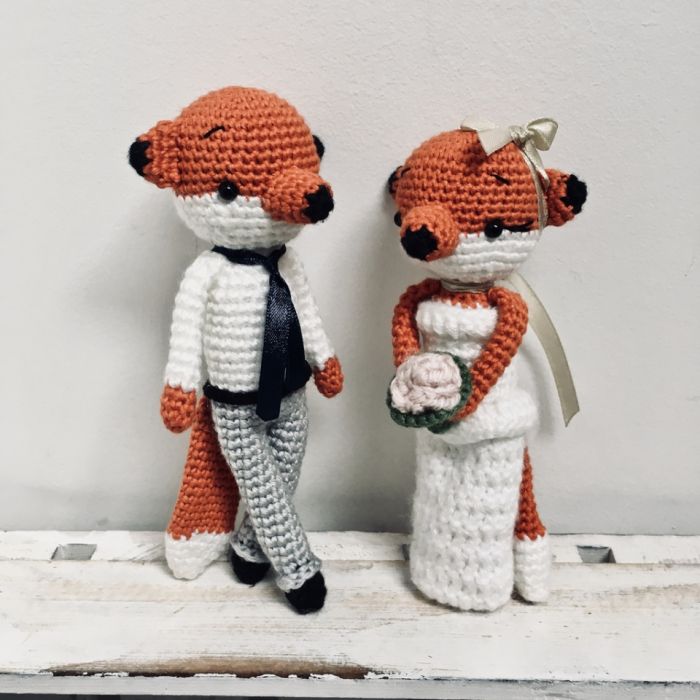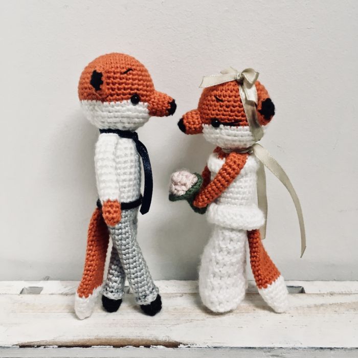 Młoda Para - liski maskotki, wykonane ręcznie na szydełku z wysokiej jakości akrylu anti-pilling (niemechacący się) z certyfikatem OEKO-TEX Standard 100i bawełny, wypełnione antyalergicznym wkładem poduszkowym.