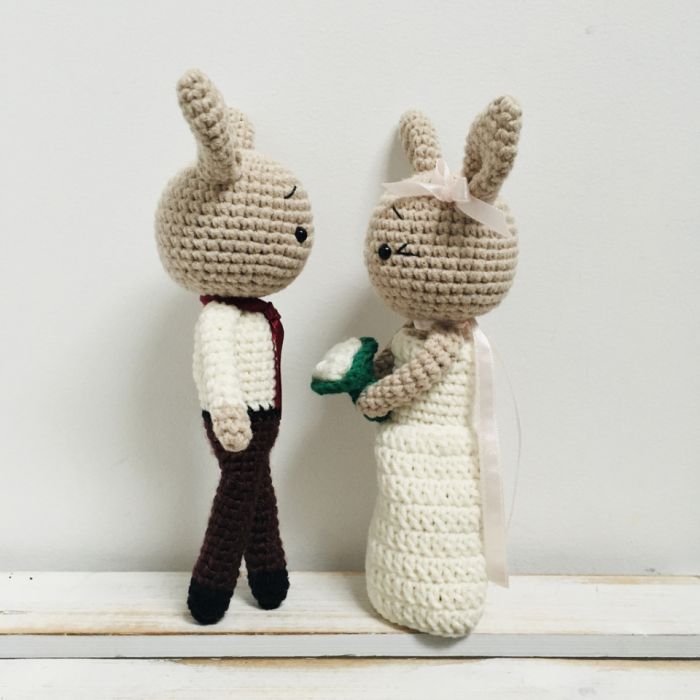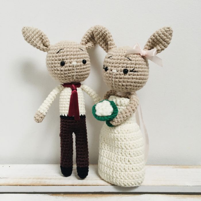 Młoda Para - króliczki maskotki, wykonane ręcznie na szydełku z wysokiej jakości bawełny z akrylem i akrylu anti-pilling (niemechacący się) z certyfikatem OEKO-TEX Standard 100, wypełnione antyalergicznym wkładem poduszkowym..