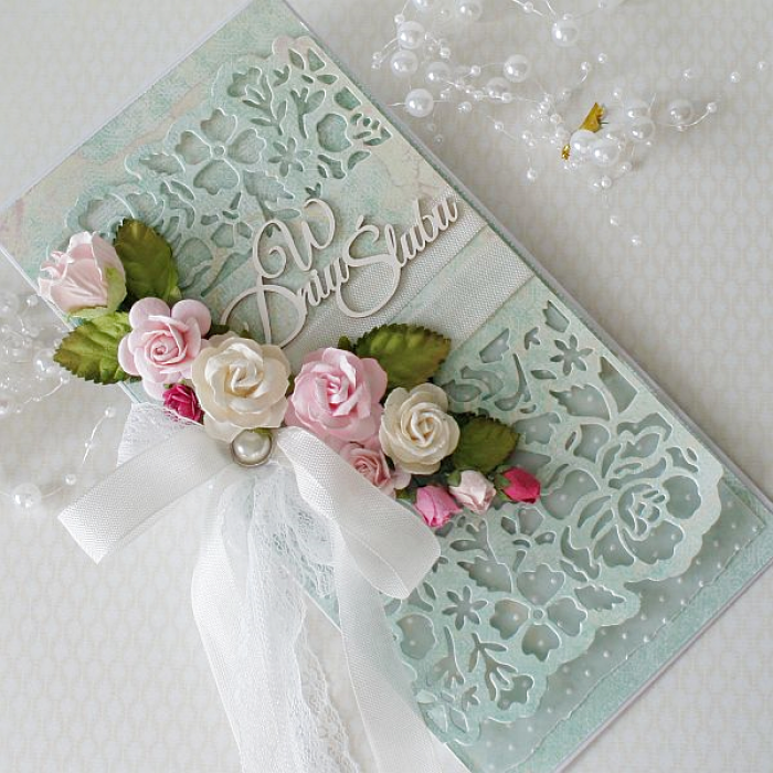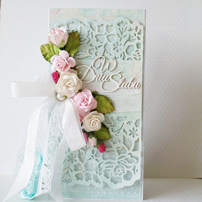 Urocza, oryginalna i romantyczna kartka ślubna w pięknym miętowym kolorze.