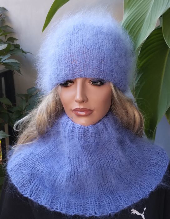 Moherowy komplet czapka i komin,zrobione ręcznie na drutach z mieszanki moheru i akrylu w kolorze jasno niebieskim.Włóczka puszysta, miękka, ma śliczny włos. Rozmiar uniwersalny. Producent włóczki zaleca pranie ręczne w temperaturze 30 stopni, suszyć na leżąco. Płukać w płynie zmiękczającym.