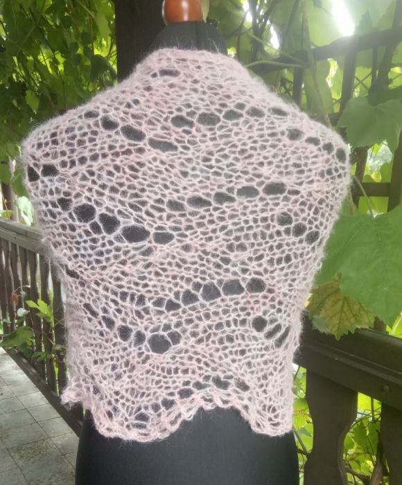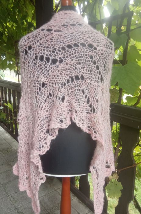 Różowy elegancki szal w całości wykonany ręcznie na drutach pięknym wzorem. Jest bardzo delikatny, leciutki i puszysty. Będzie doskonałym dodatkiem ślubnym, wieczorowym lub codziennym. Ozdobi każdą stylizację. Jest plastyczny i rozciągliwy, więc można nosić go na różne sposoby.