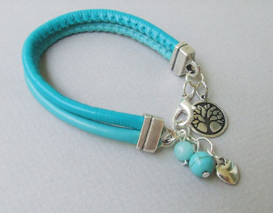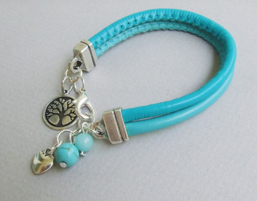 Mięciutka, bardzo miła bransoletka wykonana z dwóch rzemyków szytych w kolorze jasnego i ciemnego morskiego, cudnej zawieszki dwustronnej LIFE, serduszka i jadeitu, a także howlitu. Na nadgarstek 15-18 cm.
