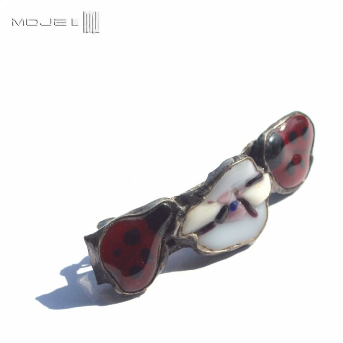Klamra do włosów ze szkła w odcieniach ciemnej czerwieni, odcieni bieli i bladziutkiego różu. Szkło wytopiłam metodą fusingu, miedź jest cynowana, patynowana i przecierana. Klamra to standardowy metalowy mechanizm.