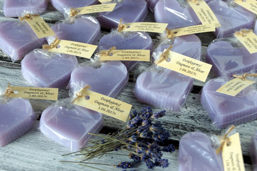 Mydełka lawendowe robione ręcznie,z naturalnym olejkiem lawendowym w klorze fioletowym.Mydełko waży 25 g( +/- 5 g) ma wymiary 1 x 6 cm, ma kształt serduszka i jest zapakowane w folię ochronną. Mydełka idealnie nadają się na prezenty dla gości weselnych oraz uczestników innych imprez. Aby zamienić etykietkę z napisem "Mydło lawendowe...., ręcznie robione" na podziękowanie/dedykację - wystarczy podać treść-podziękowanie/dowony napis drukuję gratis. Na życzenie biały kolor. Gałązki lawendy są przesyłane oddzielnie ze względu na kruchość, włożenie ich pod zawieszkę zajmuje dosłownie chwilę a efekt jest naprawdę piękny!