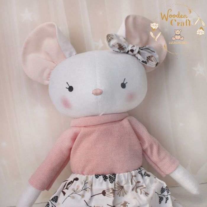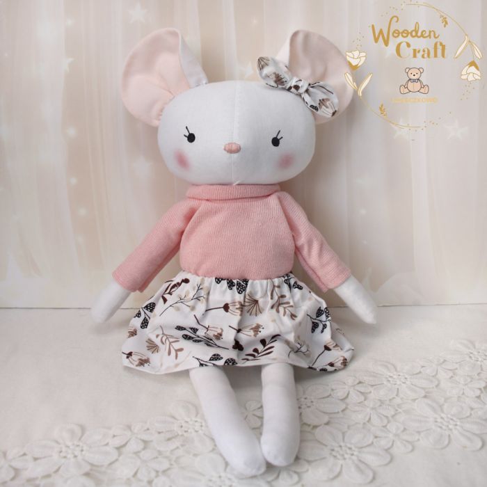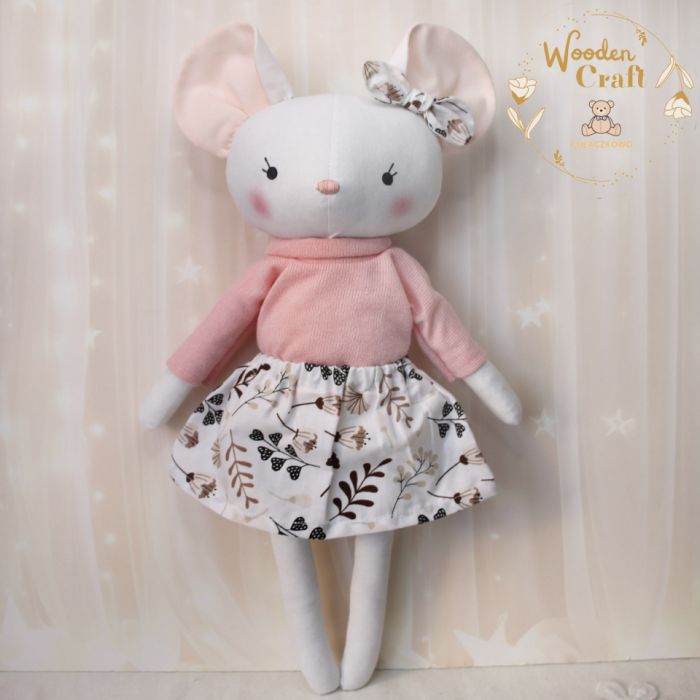 Przeurocza przytulanka, biała myszka, uszyta ręcznie z najwyższą starannością, ubrana w różowy sweterek, i spódniczkę w jesienne motywy, z kokardką na uszku. Wykonana ze 100% bawełny, wypełniona antyalergiczną kulką silikonową. Oczka malowane wodoodpornym markerem, nosek wyszyty muliną. Spódniczkę i sweterek można swobodnie zdejmować, posiadają gumeczki. Górne i dolne łapki układają się luźno, myszka siedzi z podparciem.