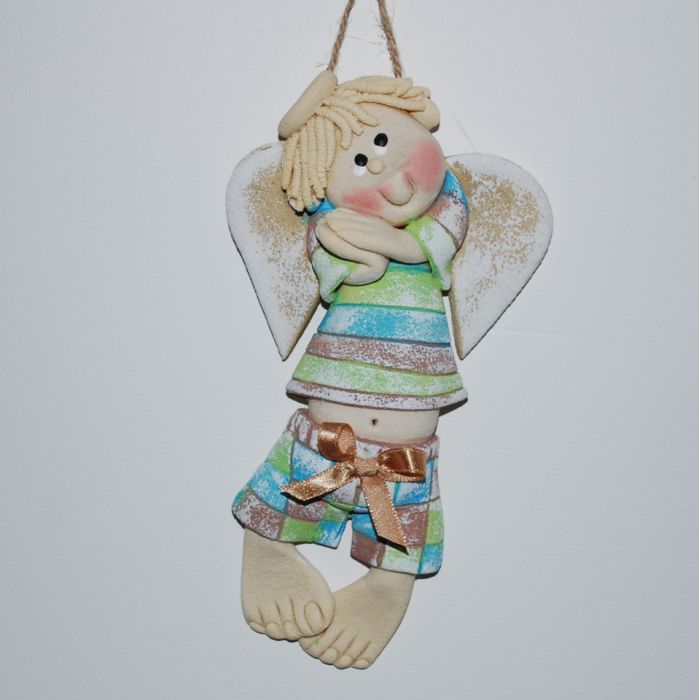 Kolorowy aniołek - rękodzieło - każdy inny. Wykonałam go z myślą, że sprawdzi się jako wisząca, dekoracja pokoju dziecięcego lub będzie doskonałym prezentem dla dziecka z okazji: urodzin, chrzcin, komunii świętej lub prezentem świątecznym. Do wykonania anioła wykorzystałam masę solną, samodzielnie ją “kulając” i malując. Posiada zawieszkę w postaci dratwy lub sznurka konopnego i z tyłu zabezpieczony jest lakierem akrylowym. Do wysyłki pakuję anioła w celofanowy woreczek i przewiązuję rafią naturalną. Każdy z aniołów przechodzi przez moje ręce co najmniej 10 razy i to chyba mnie inspiruje do wymyślania nowych wzorów. Na Państwa życzenie postaram się wykonać anioła zgodnie zapotrzebowaniem. Informację o zamówieniu należy przesłać do galerii. Wielkość, bez zawieszki ok. 16-18 cm. Zapraszam