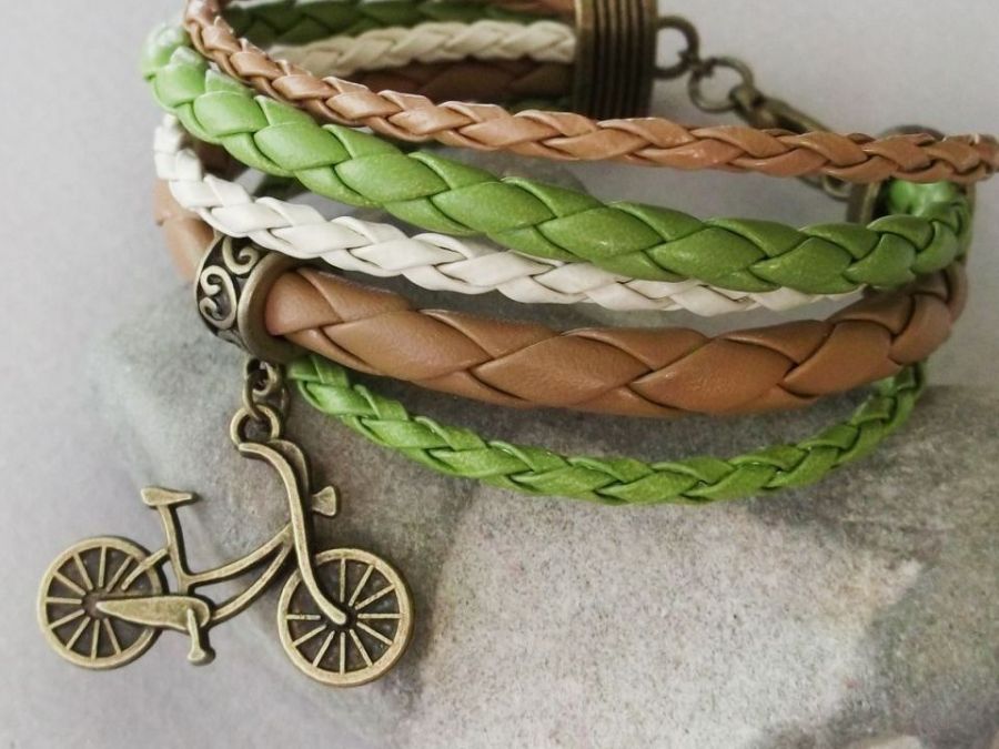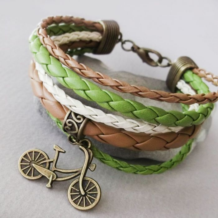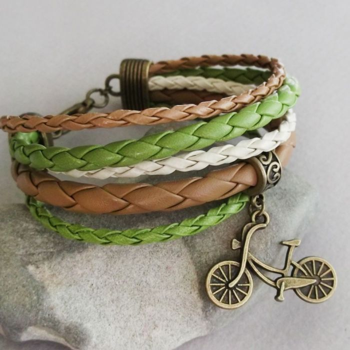Bransoletka w bardzo naturalnych kolorach nieco oliwkowej zieleni, beżu i brązu. Oprawa w kolorze antycznego brązu. Zawieszka dwustronna. Na nadgarstek 15-17 cm.