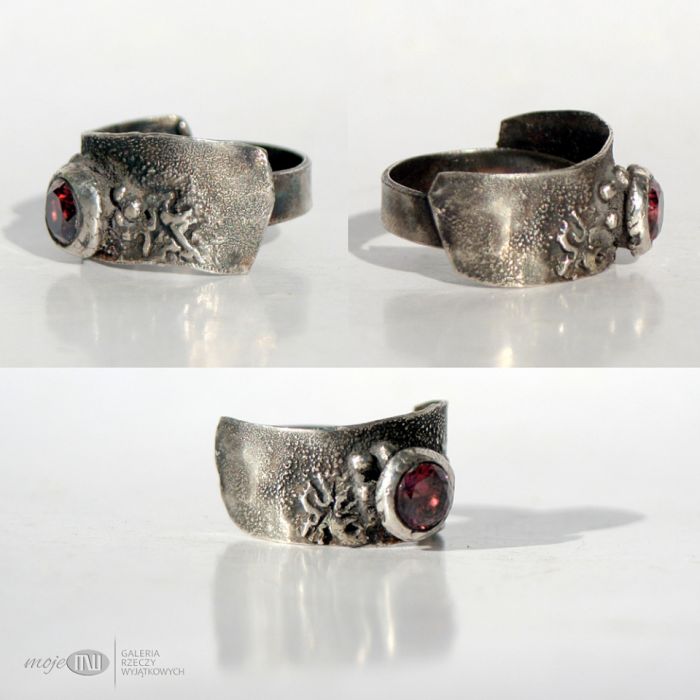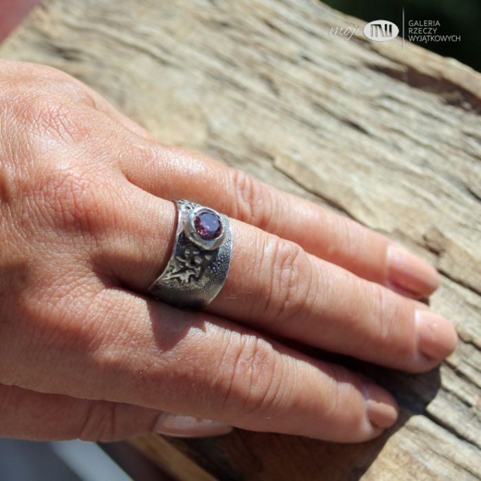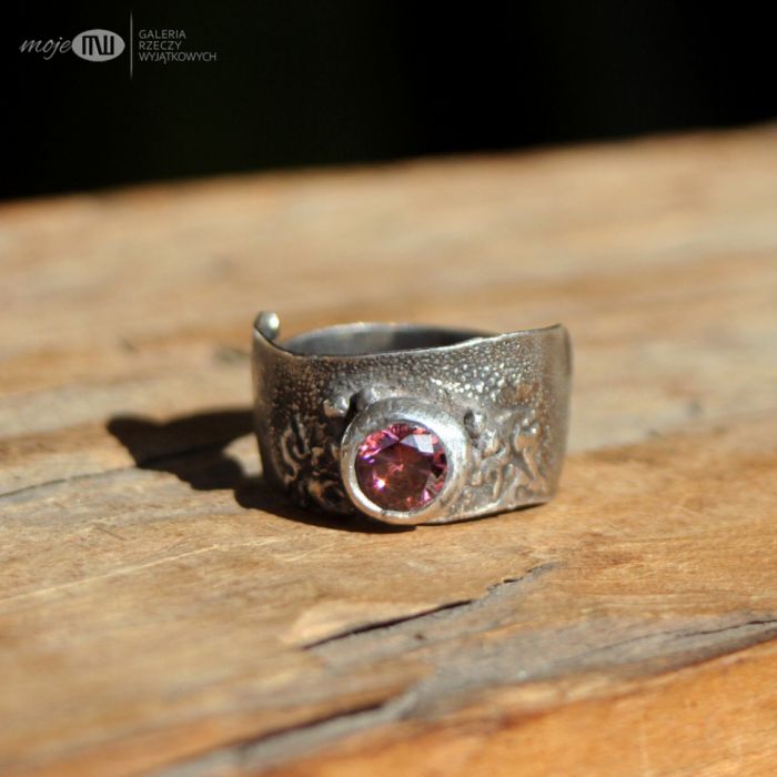 Pierścionek/obrączka z fasetowaną cyrkonią we wrzosowym kolorze. Srebro jest oksydowane i przecierane dla wydobycia delikatnej faktury i małych listków na obrączce.