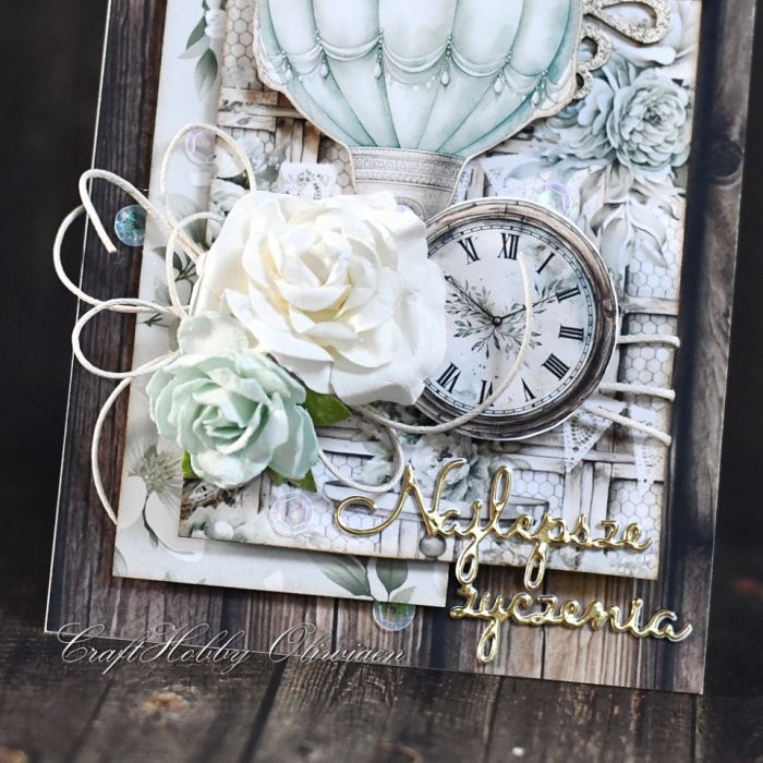 Wykonana z bezkwasowych papierów do scrapbookingu, ozdobiona motywami wyciętymi z papieru, kompozycją kwiatów mulberry, misternie wycinanym ornamentem z tekturki beermat embossowanym wielobarwnym pudrem, sznureczkiem i opalizującymi cekinami.