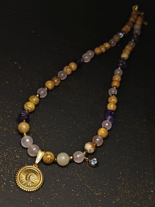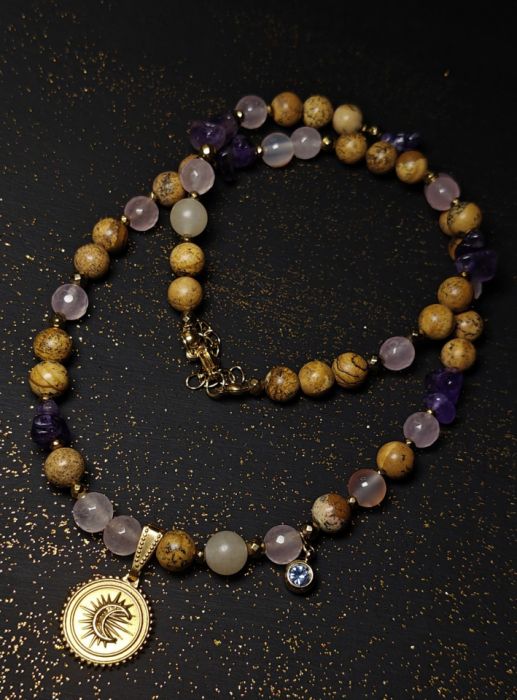 Naszyjnik „Luna Solis” to ręcznie wykonany projekt z kamieni naturalnych, utrzymany w ciepłej, eleganckiej tonacji. Jego długość wynosi około 53 cm + 5 cm łańcuszka przedłużającego. To biżuteria, która zachwyca subtelnym połączeniem barw i faktur – od delikatnych pasteli po ziemiste odcienie.