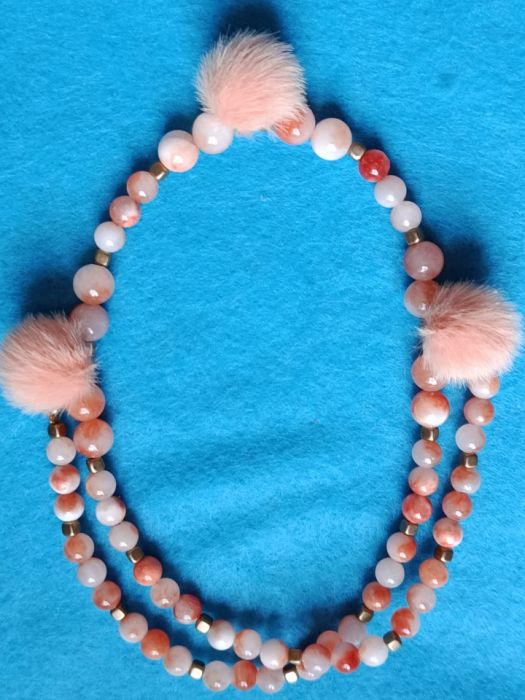 Naszyjnik długości 50 cm wykonałam na lince jubilerskiej z agatów w kolorze biało -brzoskwiniowym. Agaty o rozmiarze 6 i 10 mm ozdobione dodatkowo 3 pomponami w kolorze brzoskwiniowym.