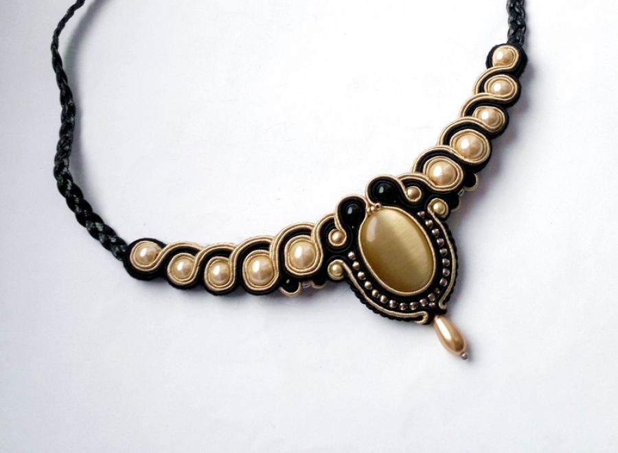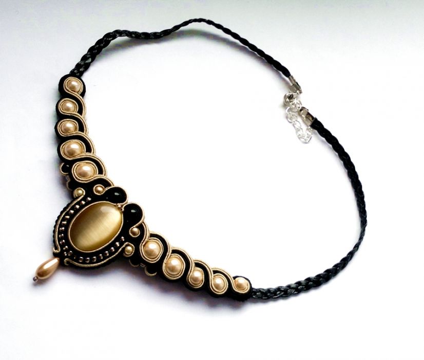 Centrum naszyjnika-kolii stanowi wypukły kaboszon „Kocie oko” 25 x 18 mm w kolorze bezowo-złoto-miodowym. Perełki są w beżowo-złotym kolorze, sznurki sutasz czarne i złote jedwabiste, użyty miękki rzemień ze skóry ekologiczną.