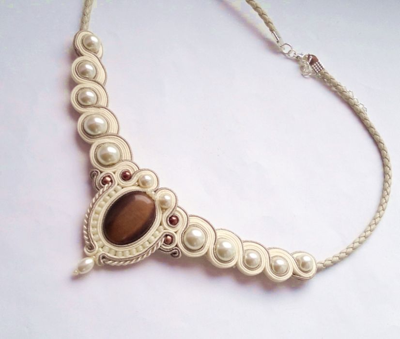 Centrum naszyjnika-kolii stanowi wypukły kaboszon „Kocie oko” 25 x 18 mm w kolorze jasnobrązowym. Perełki są w jasnokremowym kolorze, sznurki sutasz kremowo-waniliowe i beżowe jedwabiste, użyty rzemień plecony ze skóry ekologiczną w beżowym kolorze.