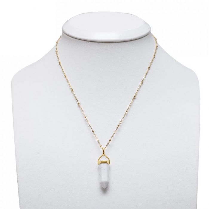 Wybierasz autentyczność i trwałość. Zawieszka z naturalnego howlitu w kolorze białym jest idealnie szlifowana i oprawiona, podkreślając jej unikalne wzory. Łańcuszek to hipoalergiczna stal szlachetna, pokryta trwałym złoceniem, co zapewnia komfort i odporność na czernienie.