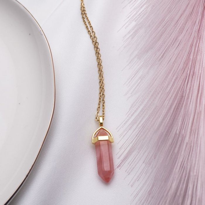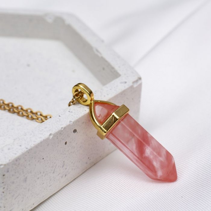 Wybierasz efektowny design i trwałość. Zawieszka z Kwarcu Wiśniowego charakteryzuje się głębokim, różowym kolorem i unikalnym efektem rysunku. Łańcuszek to hipoalergiczna stal szlachetna, pokryta trwałym złoceniem, co zapewnia komfort i odporność na czernienie.