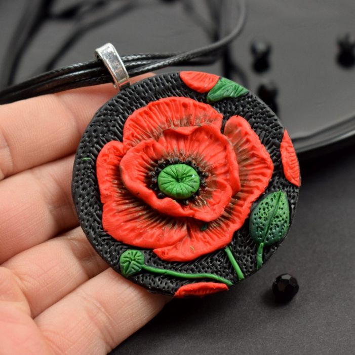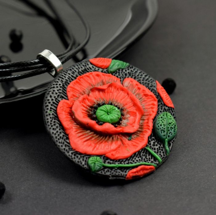 Przyciągający uwagę, duży naszyjnik w kształcie koła z motywem kwiatu maku. Przepiękne połączenie czerwieni i czerni z dodatkiem zieleni dodaje charakteru każdej stylizacji.