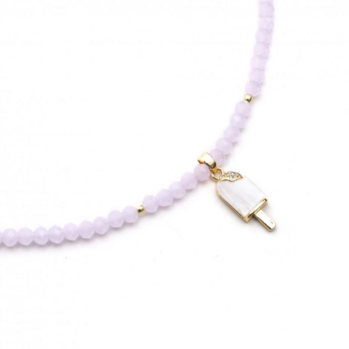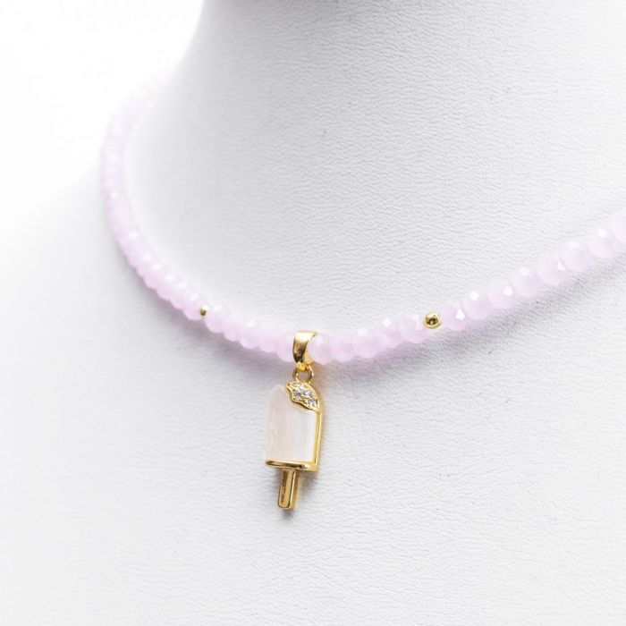 Poczuj lekkość i pozytywną energię! Bladoróżowe, fasetowane szklane oponki pięknie odbijają światło, wprowadzając do Twojego looku romantyczny, subtelny blask. Urocza zawieszka w kształcie loda z mieniącą się masą perłową przywołuje wspomnienia słodkich, letnich chwil – idealny element do celebrowania codzienności. To biżuteria, która wzbudza czułość i radość.