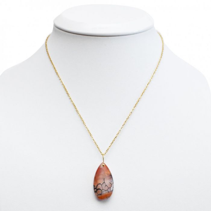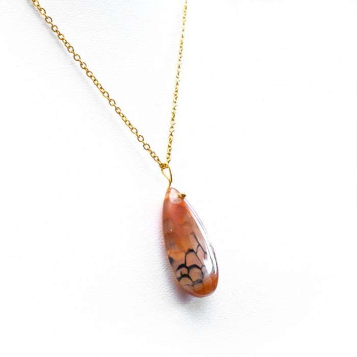 Agat Smoczy jest kamieniem znanym z właściwości stabilizujących emocje. Jego energia pomaga wyciszyć niepokój i wzmocnić poczucie własnej wartości, otaczając Twoje serce aurą spokoju i pewności siebie. To minerał, który sprzyja budowaniu wewnętrznej siły niezbędnej do pokonywania codziennych wyzwań. Unikalny wzór "żyłek" na kamieniu symbolizuje połączenie rozproszonych myśli w jedną, spójną całość. Agat wspiera jasność umysłu, ułatwiając skupienie się na wyznaczonych celach i pomagając w podejmowaniu decyzji zgodnych z Twoją intuicją. Zawieszka o długości 30 mm została osadzona na łańcuszku ze stali chirurgicznej złoconej złotem, co stanowi solidny fundament dla tego naturalnego skarbu. Stal jest hipoalergiczna, nie ciemnieje i zachowuje swój blask przez długi czas, zapewniając komfort noszenia każdego dnia.