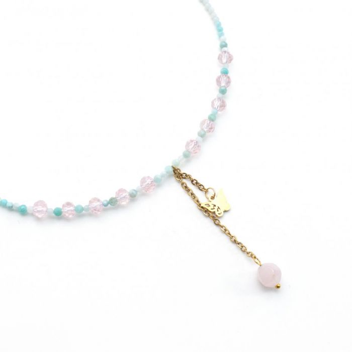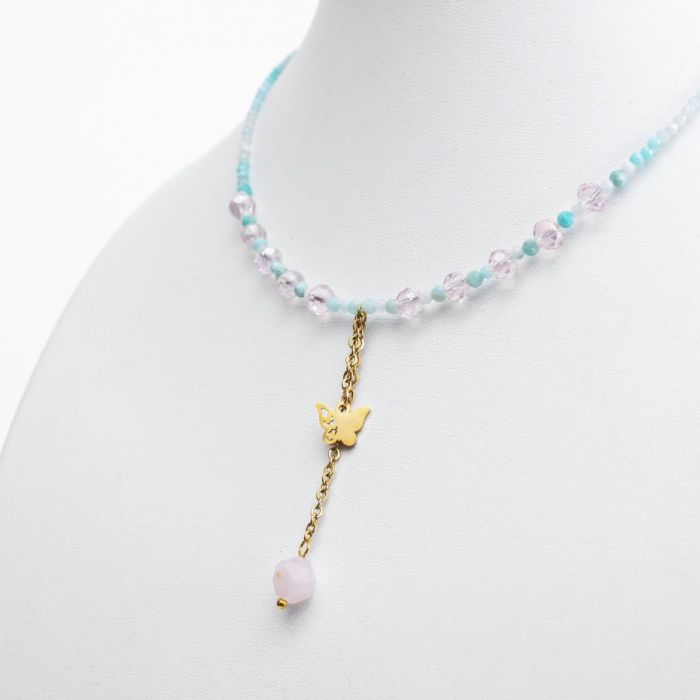 Odkryj "Eforianę" – naszyjnik, który symbolizuje przemianę i wewnętrzny spokój. To niezwykłe połączenie chłodnej, turkusowej barwy Amazonitu z delikatnym blaskiem Kwarcem Różowym.