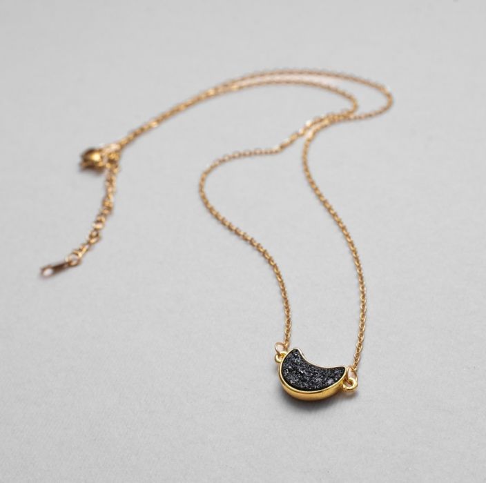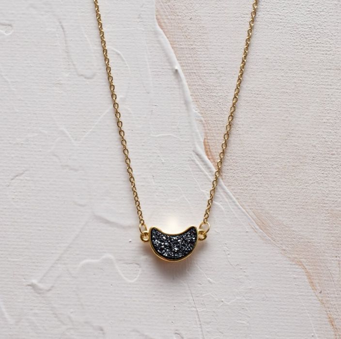 Wybierasz trwałość i efektowny design. Zawieszka w kształcie księżyca wykonana jest z wysokiej jakości żywicy, która imituje naturalny, brokatowy blask druzy. Łańcuszek to hipoalergiczna stal szlachetna, pokryta trwałym złoceniem, co zapewnia komfort i odporność na czernienie.