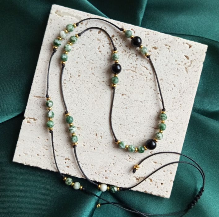 Regulacja za pomocą plecionki makramowej. Długość całkowita 60 cm + 2x5 cm regulacji.