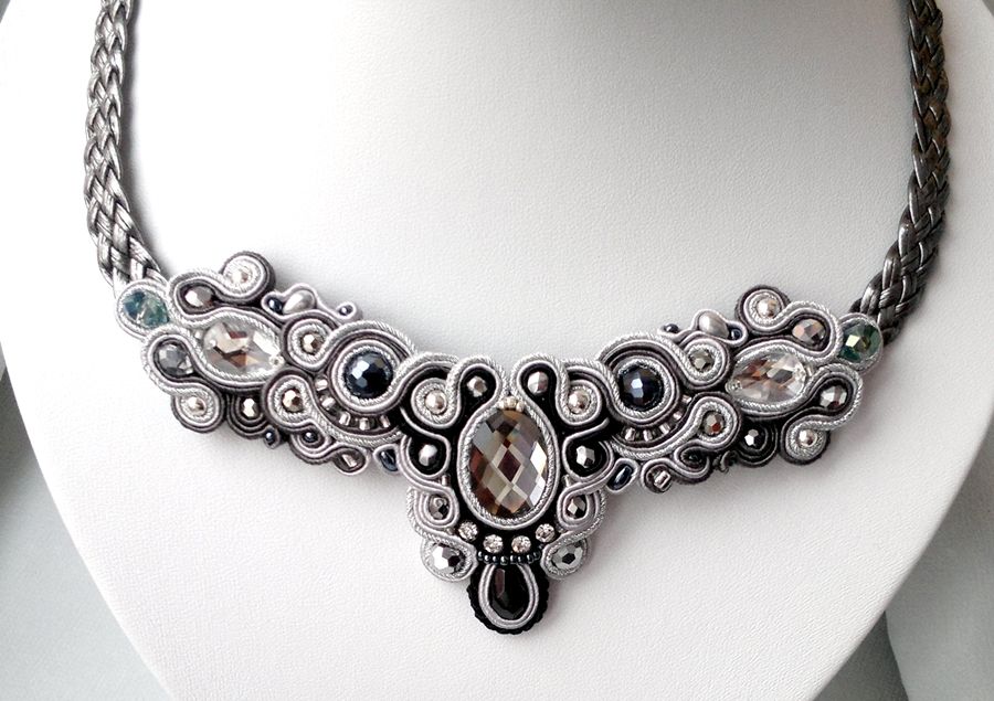 Zostały użyte szlachetne materiały: crystal Black Diamont, fasetowane kryształy, sznurki sutasz jedwabiste w kolorze czarnym, szarym, grafitowym i metalizowane w kolorze srebra wyższej jakości. Każdy kryształ cudownie się mieni diamentowym połyskiem i niesamowicie odbija światło!