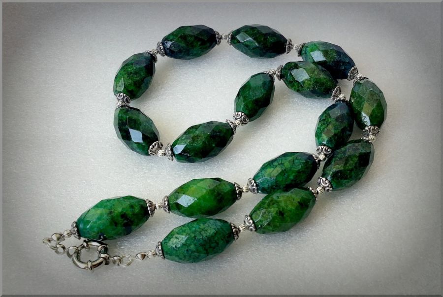 Naszyjnik wykonany został z pięknej, wysokiej jakości chryzokoli w kształcie fasetowanych beczułek 25/15mm oraz przekładek bali. Długość naszyjnika około 58cm.