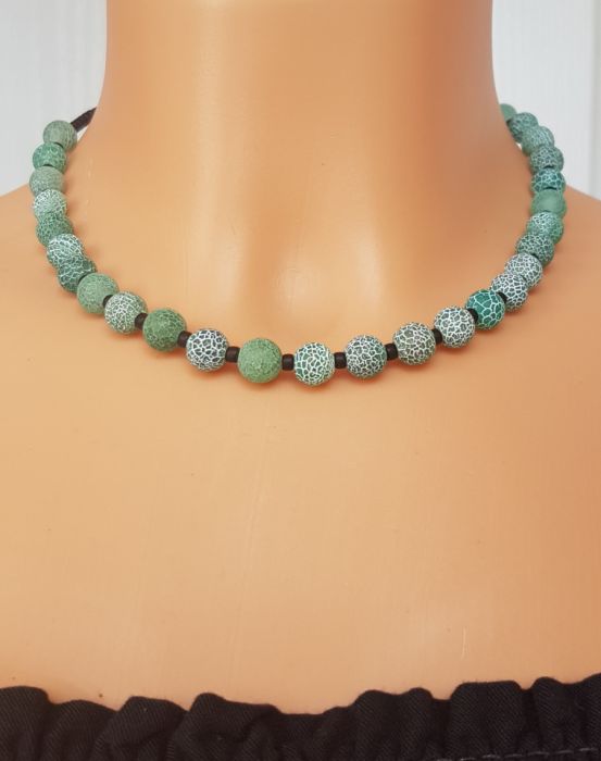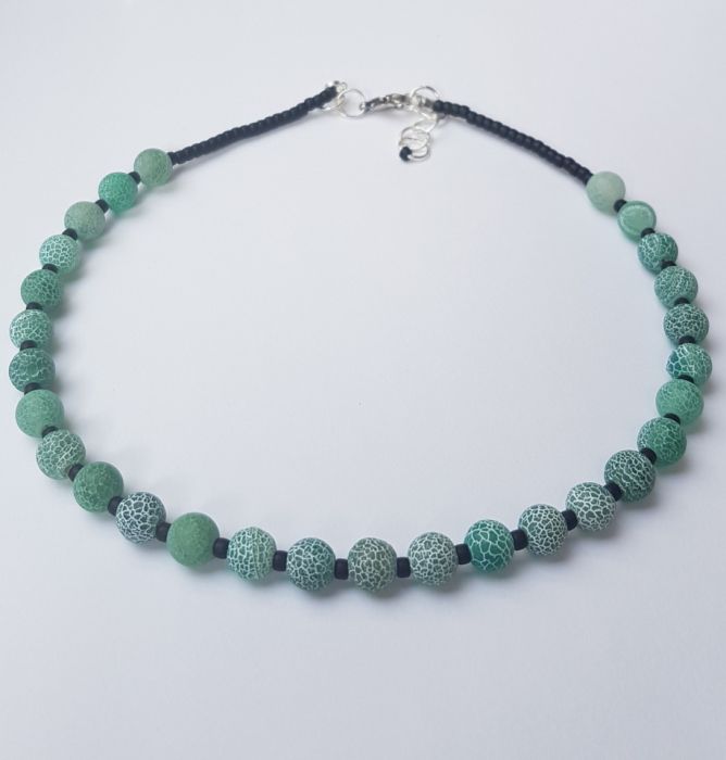 Naszyjnik z kul 8 mm agatu trawionego i małych, matowych koralików szklanych w kolorze czarnym. Naszyjnik jest krótki. Objętość wynosi 39 cm plus 2 cm łańcuszka, zapięcie stal w kolorze srebrnym.