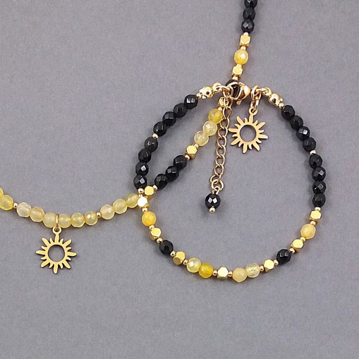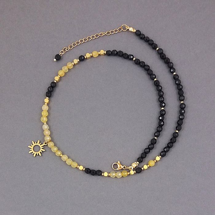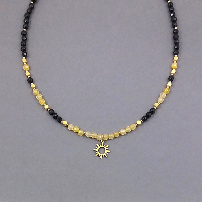 Elegancki, krótki naszyjnik z fasetowanych kulek czarnych i żółtych agatów, i ściętych kostek złotego hematytu. Kamienie mają średnicę 4 mm. Wykończenie i delikatna zawieszka słońce z nieuczulającej, pozłacanej stali szlachetnej.