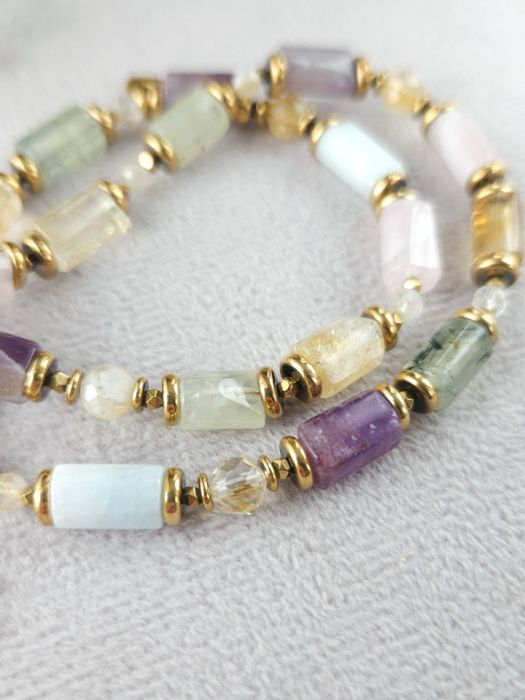 Cytryn, ametyst, akwamaryn, prehnit, kwarc różowy, hematyt, stal