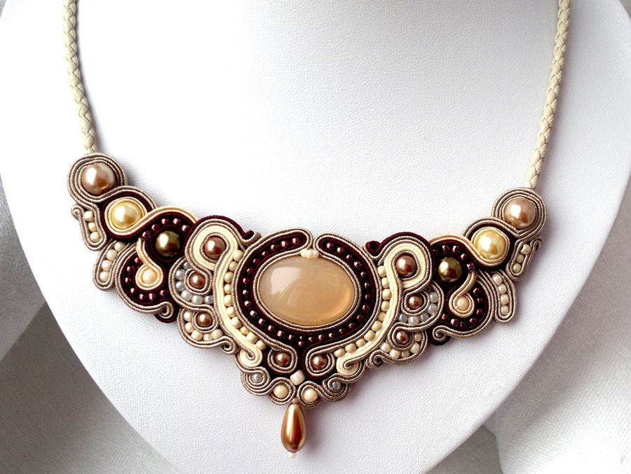 Piękny i efektowny naszyjnik w kolorach kremu, beżu, ivory, burgund (marsala) został wykonany ręcznie pracochłonną techniką haftu sutasz. Robi wielkie wrażenie!