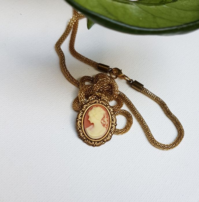Naszyjnik w stylu retro. Camea z wizerunkiem kobiety w kolorze kości słoniowej na łososiowym tle. Wisiorek w mosiężnej oprawie. Długość naszyjnika z wisiorkiem 46 cm