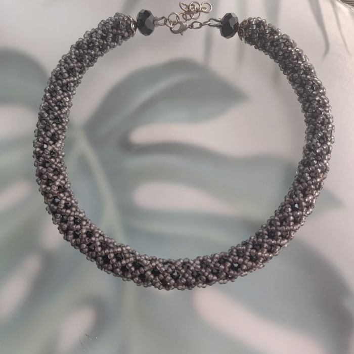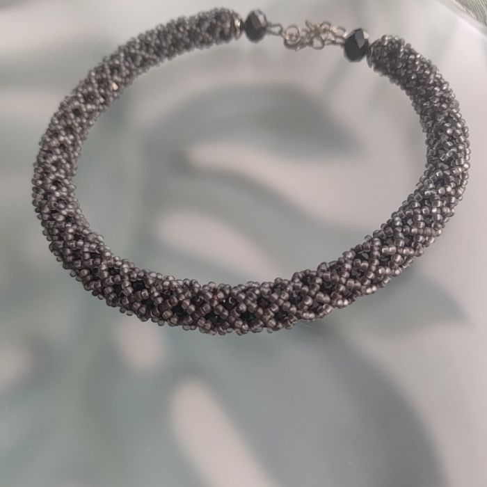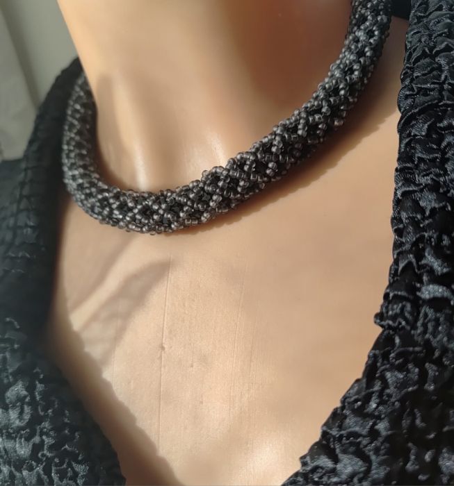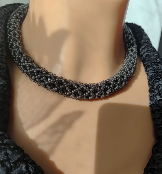 Czarny sznur z koralików w królewskim splocie, błyszczące koraliki fasetowane w szaro czarnej matowej siatce, gruby 13 mm, bardzo efektowny dodatek biżuteryjny na duże i małe okazje. Duży, ale delikatny, nawet dla pań, ktore nie lubią dużej biżuterii sprawdzi się doskonale, bo mimo bogatego splotu nadal pozostał delikatny i lekki. Długość sznura w linii prostej wynosi 40 cm, szkło, metal, stal