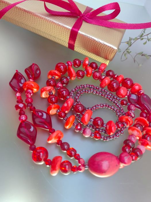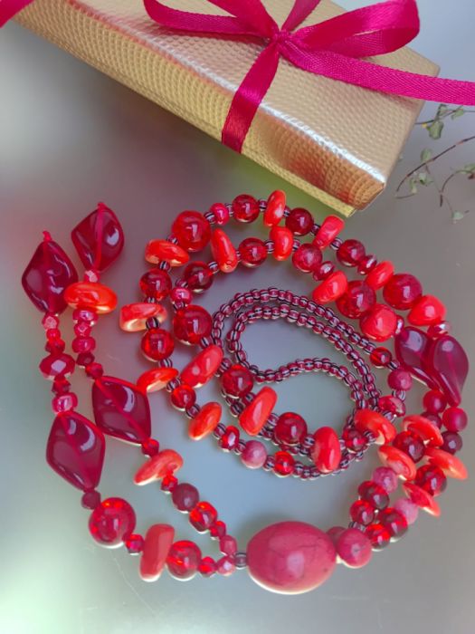 Naszyjnik długi z koralików. Mix koralików szklanych, howlit czerwony i koral czerwony bryłki, hematyt. Delikatny, efektowny naszyjnik. Bez zapięcia, przekładany przez głowę. Na sznurku syntetycznym czerwonym. Długość naszyjnika z frędzlami wynosi 48 cm