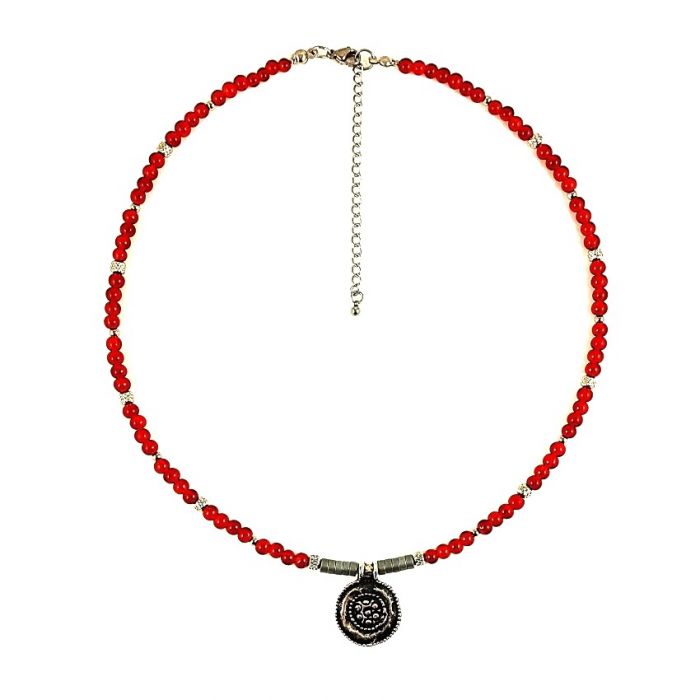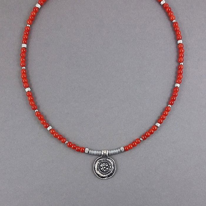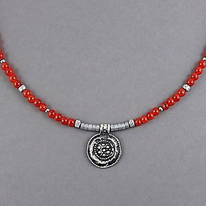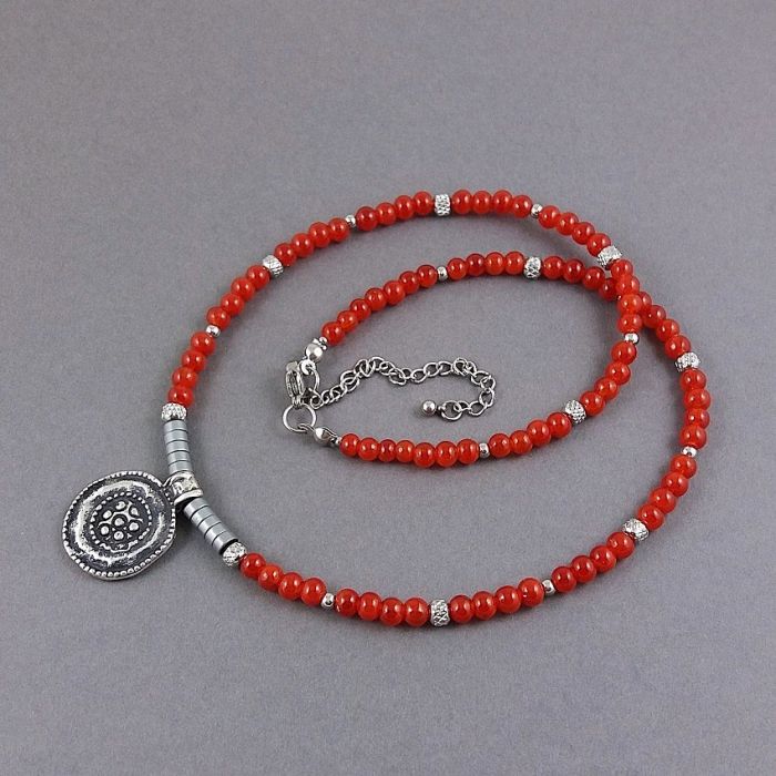Naszyjnik w stylu etno z gładkich szklanych koralików, w kolorze zgaszonej czerwieni (kolor karneolu), srebrnych matowych krążków hematytu i nieuczulającej stali szlachetnej. Koraliki mają średnicę 4 mm. Centralnie umieszczona jest oryginalna zawieszka z posrebrzanej miedzi, o średnicy ok. 2 cm.