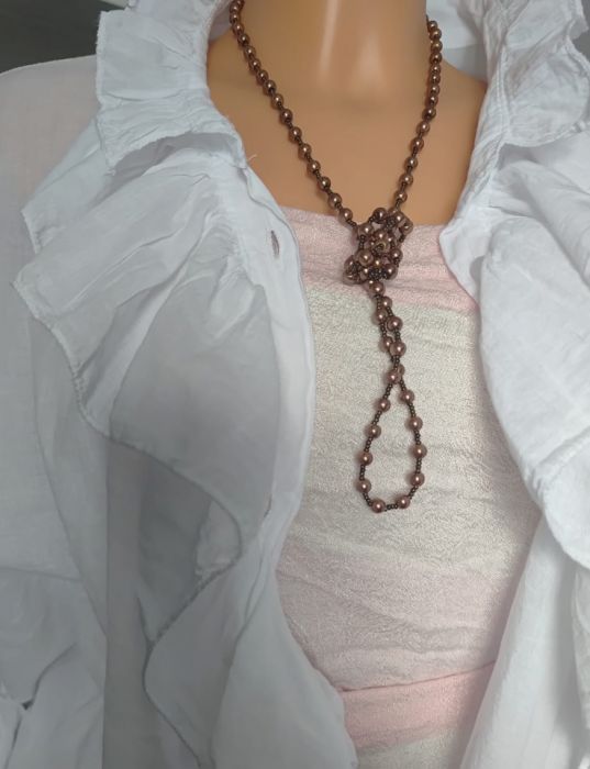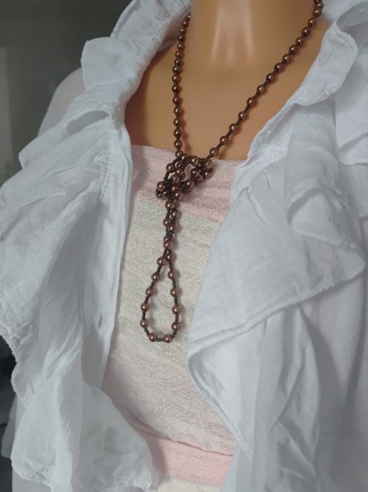 Perełki szklane małe 5 mm i koraliki drobne szkło w kolorze metalizowanym. Sznur długi 47 cm, kolor zlotego brązu. Lekki naszyjnik bez metalu, bez zapięcia, zakładany przez głowę.