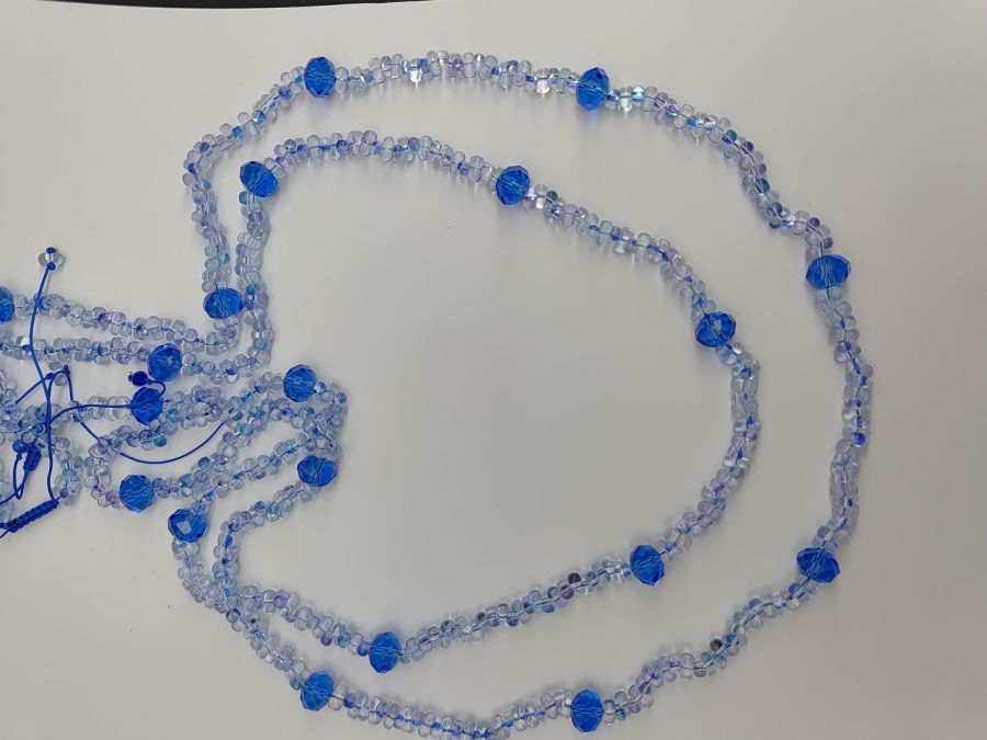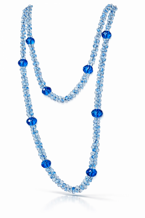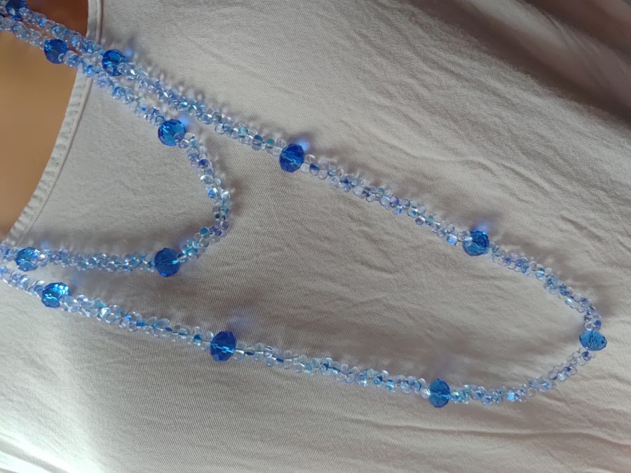 Dwa sznury korali niebieskich przeplatanych kryształkami dużymi 10 mm, efektowny naszyjnik, korale niczym kryształ mienią się i odbijają światło. Długość sznura długiego 45-52 cm, długość krótkiego sznurka 30-40 cm