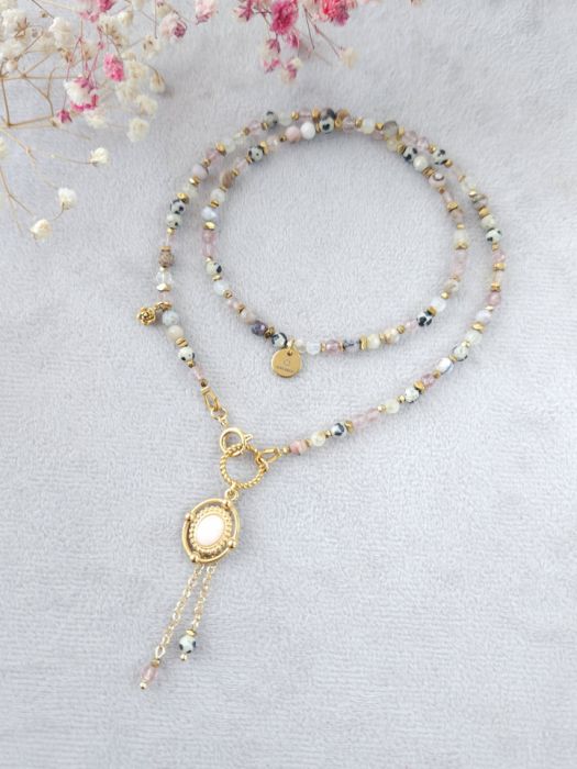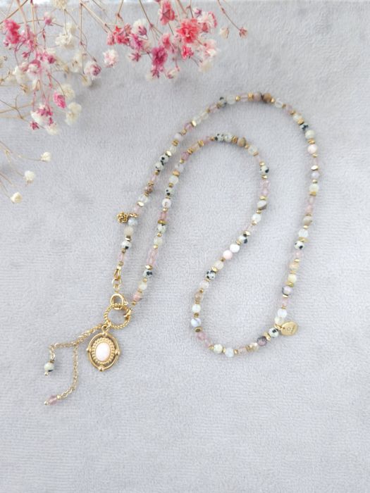 Opal różowy, kwarc truskawkowy, jaspis dalmatyńczyk, cytryn, hematyt, stal