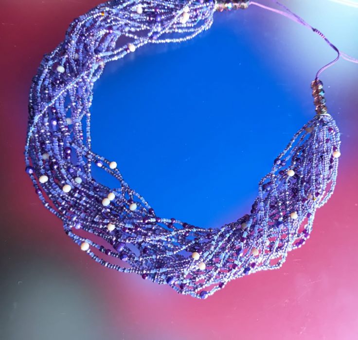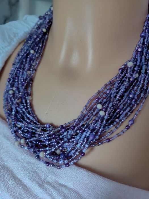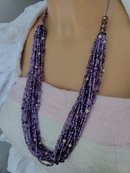 Naszyjnik z mixu koralików w odcieniach fioletu. Perełki fioletowe czeskie 3 i 5 mm, koraliki rurki, metalizowane drobinki 2 mm i wiele innych kolorystycznie pasujących do siebie koralików. Całość przełamują szklane kryształki w kolorze nude, a całości dopełniaja kryształki 8 mm szklane z efektem benzynki. Naszyjnik zrobiony jest na sznurku syntetycznym, mocnym, a zapięcie wyplecione ściegiem makramy co pozwala na dużą regulację objętości od 45 do 65 cm objetości, Szkło, sznurek syntetyczny, metalowe przekładki.