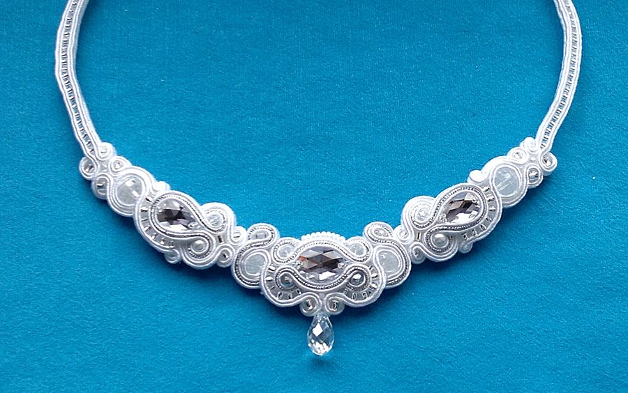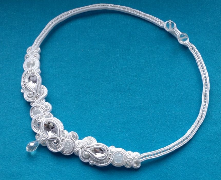 Piękna, lśniąca, srebrzysta, krysztaliczna i efektowna kolia została wykonana ręcznie pracochłonną techniką haftu sutasz. Robi wielkie wrażenie!!!