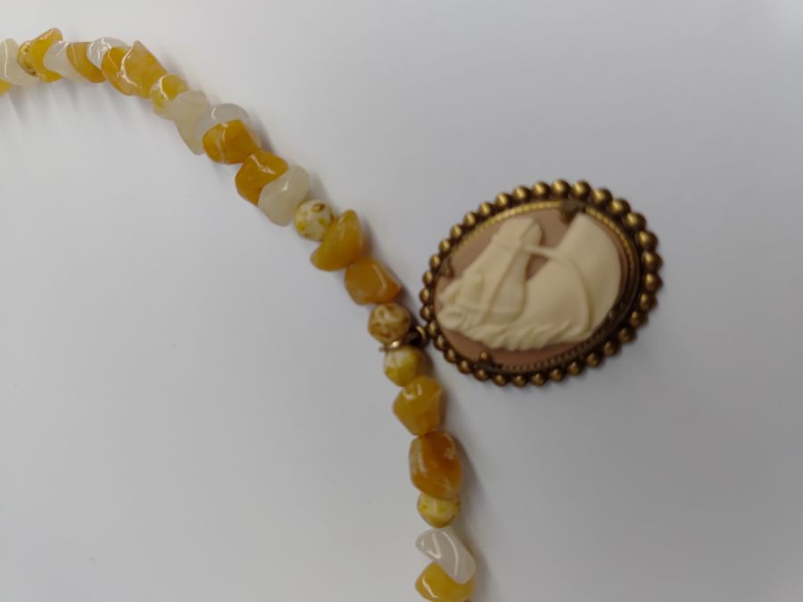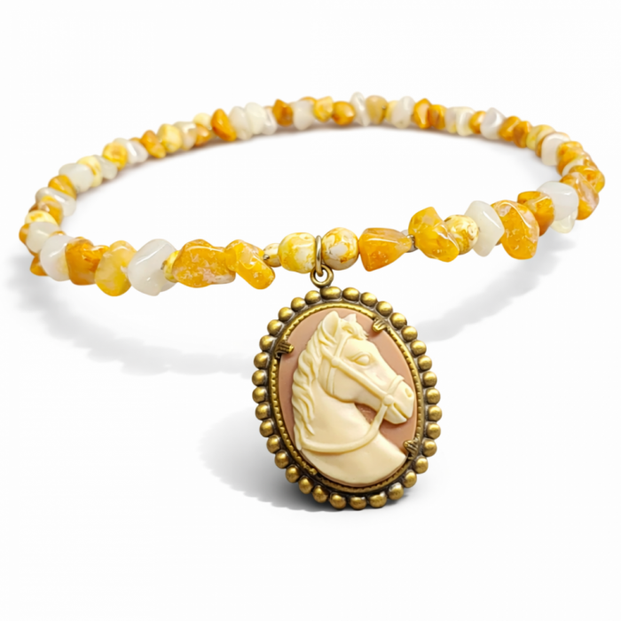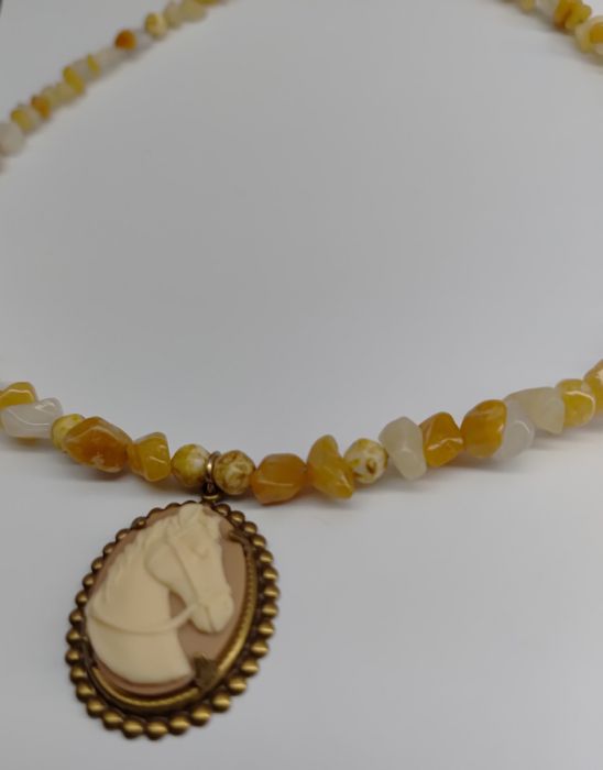 Naszyjnik krótki choker kamień naturalny karneol bryłki z domieszką małych kulek szklanych koralików imitujących trawertyn. Karneol jest podkreśleniem wisiorka w podobnym kolorze. Piękna camea z głową konia w mosiężnej oprawie. Wisiorek 3,5 cm, Długość naszyjnika 25 cm