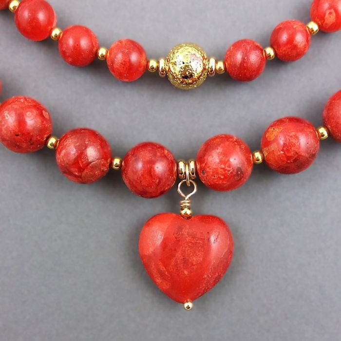 W drugim, dłuższym naszyjniku kamienie mają średnicę 8 i 6mm (lawa) i 11, 10 i 8mm (koral). Tu centralnie umieściłam zawieszkę z korala, w kształcie serca o wym. 2x2cm.