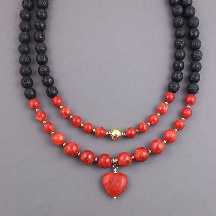 Podwójny naszyjnik z kul czarnego kamienia wulkanicznego (lawy) i korala bambusowego w niejednorodnym kolorze; czerwieni, oranżu i brązie, oraz drobnych kulek złotego hematytu.