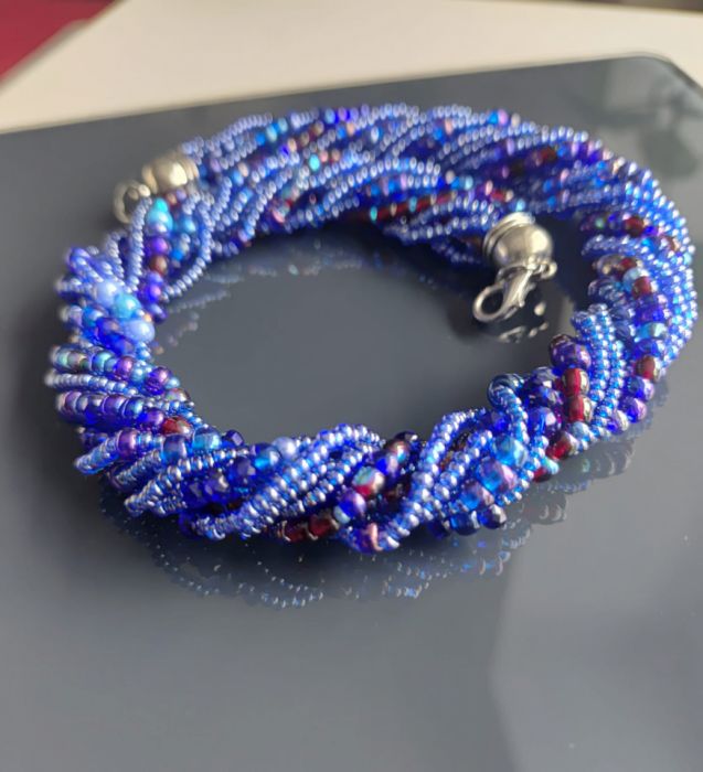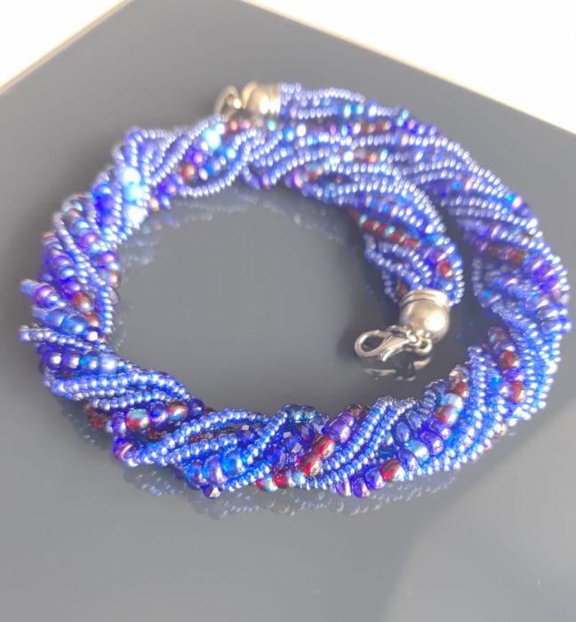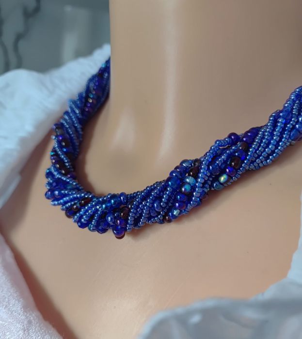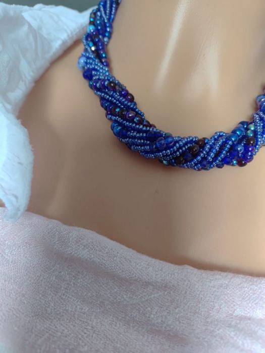 Naszyjnik krótki z koralików w odcieniach koloru niebieskiego z domieszką bordo, granatu, kryształków szklanych. Wykończenie ze stali nierdzewnej. Objętość naszyjnika wynosi 44 cm
