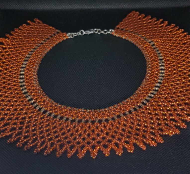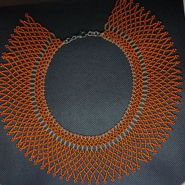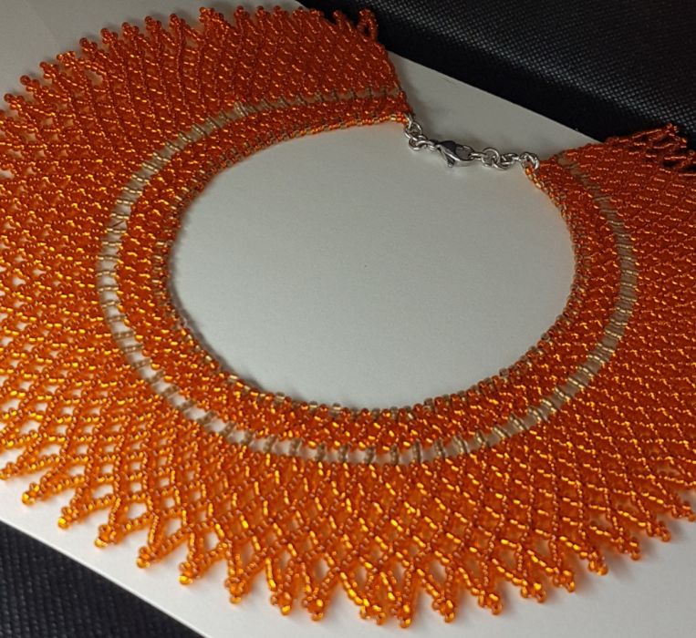 Naszyjnik krywulka,piękna ozdoba szyi, wypleciona z pomarańczowych koralików szklanych, tworząca wzór siateczki. obj 35 - 36,5 cm, szer. 53 mm, misterna plecionka z ludowym rodowodem, jednak wykonana z koralików w jednym kolorze powoduje, ze może stanowic dodatek do codziennych kreacji. Naszyjnik pięknie prezentuje się na dekolcie. Zapiecie ze stali chirurgicznej w kolorze srebrnym.