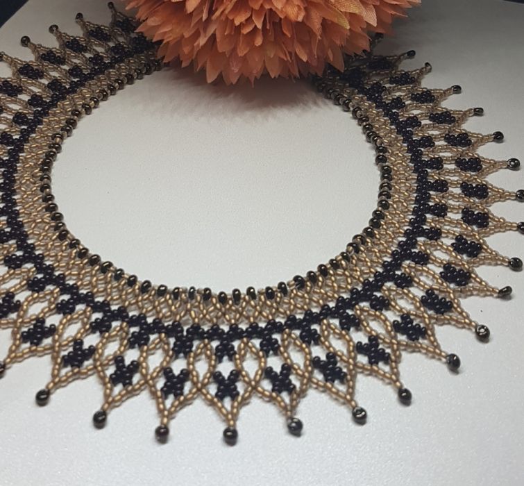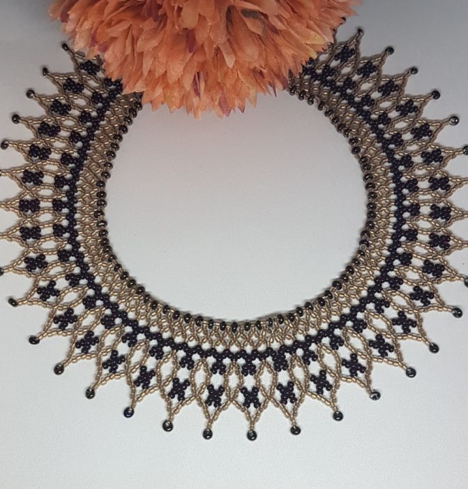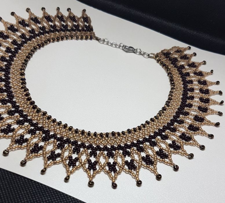 Naszyjnik krywulka, krótki pod szyję choker. Wypleciony z brązowych i złotych matowych koralików szklanych, obj 35 cm, szer. 43 mm, misterna plecionka z bardzo drobnych koralików dała piękny efekt. Naszyjnik pięknie prezentuje się na dekolcie.