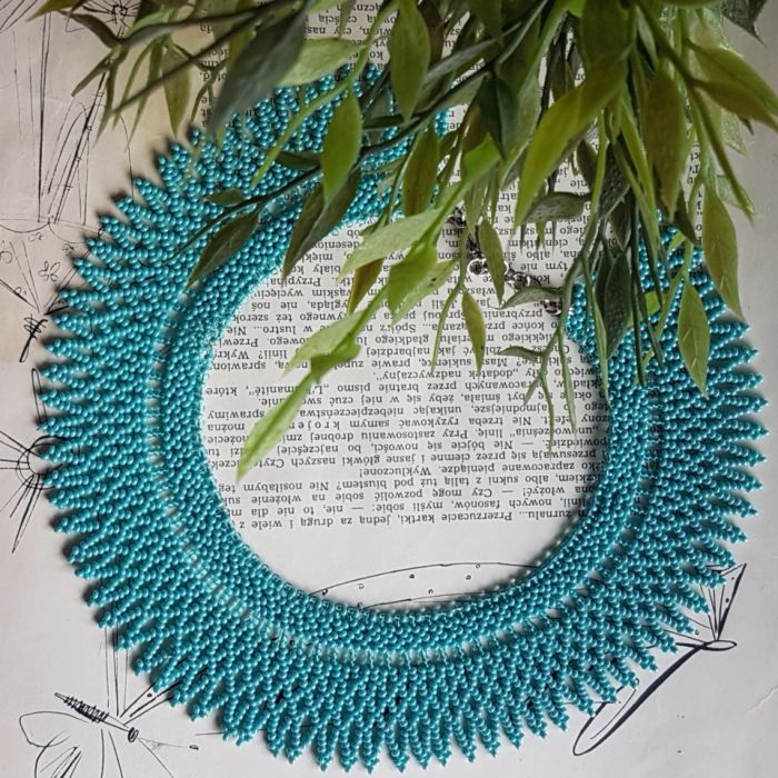 Naszyjnik z bardzo drobnych koralików szklanych w kolorze turkusowym. Misterna plecionka w formie krywulki, krótka. Szerokość 4,1 cm, objętość 31-40 cm, Zapięcie ze stali chirurgicznej w kolorze srebrnym.