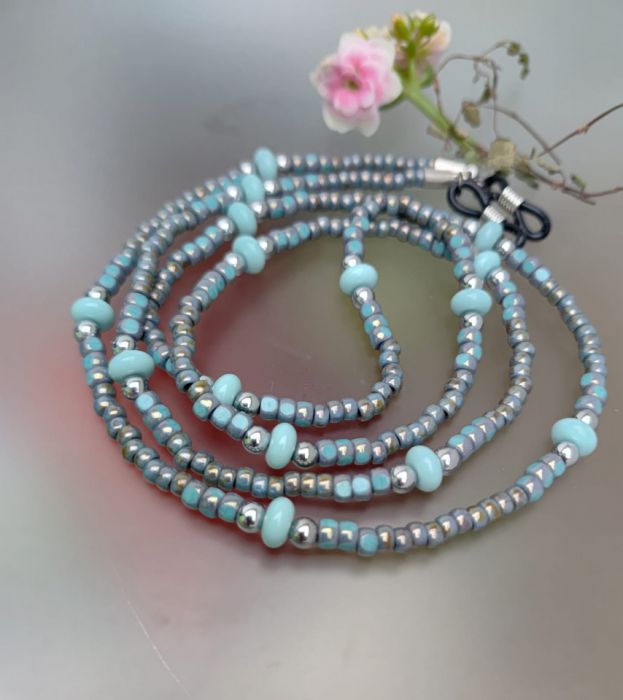 Łańcuszek do okularów ozdobny z koralików. Koraliki oponki niebieskie i mniejsze koraliki różne turkusowe, przekładki kuleczki z hematytu. Długość 87 cm, gumki zaciskowe silikonowe czarne